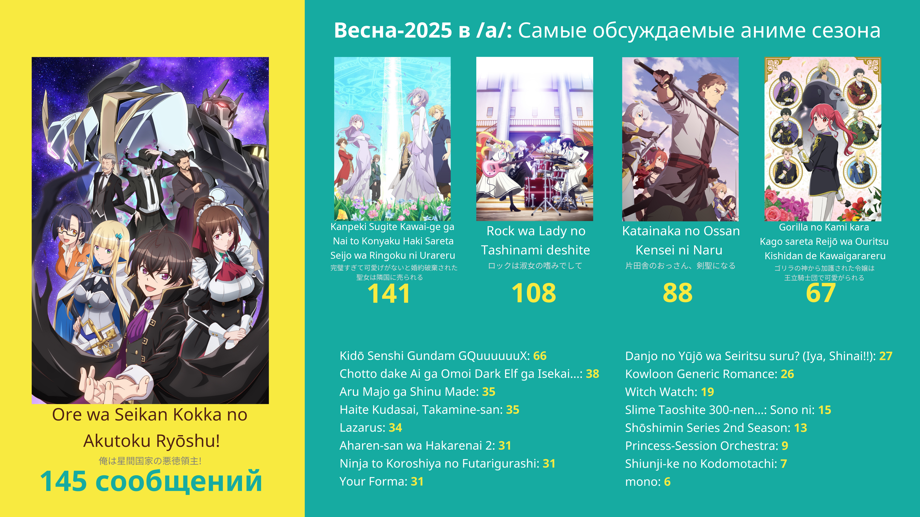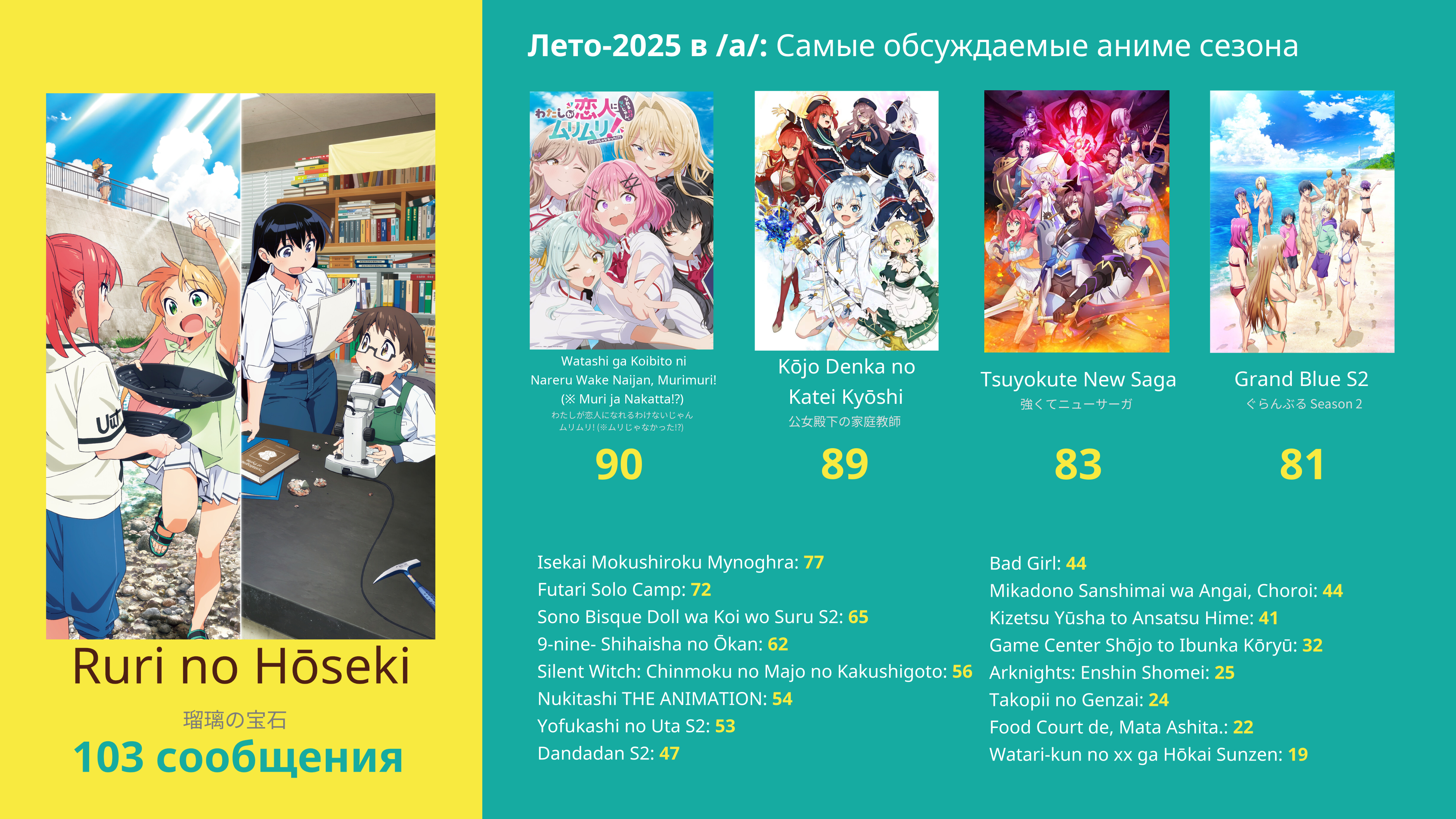 Статистика обсуждений аниме-сериалов по сезонам. Числа приведены на момент подсчёта по открытым источникам и могут отличаться от конечных. Для сериалов, продолжавшихся в следующем сезоне, подсчитана только первая половина, если не указано иное.
